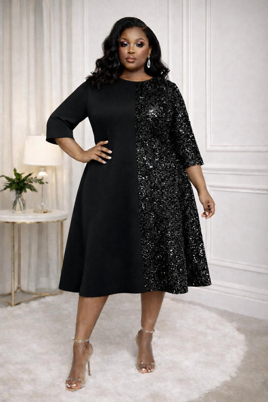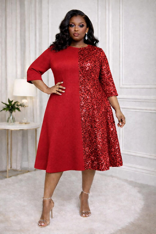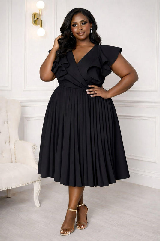 2977 Plus Size double Ruffled Sleeves Pleated Flare Midi Dresses