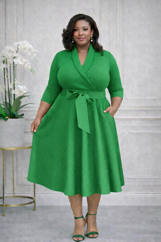 2937 Plus Size 3/4 Sleeves Flowy Warp Midi Flare Pockets and belt