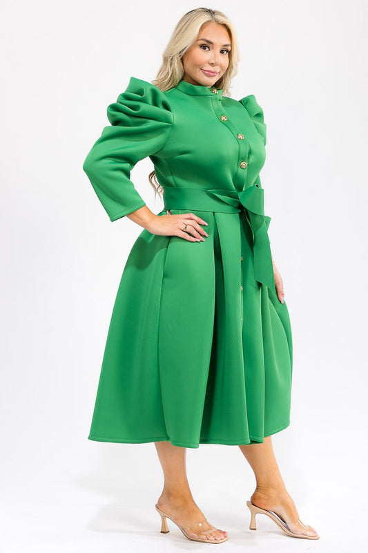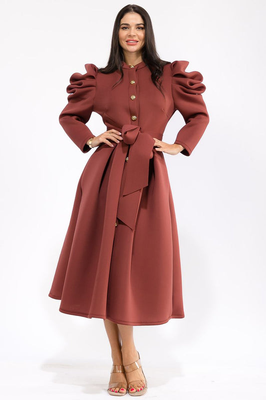 2959JQ Jacquard Smocked Cuff Raglan Sleeves Flare Midi Plated Dress With Belt