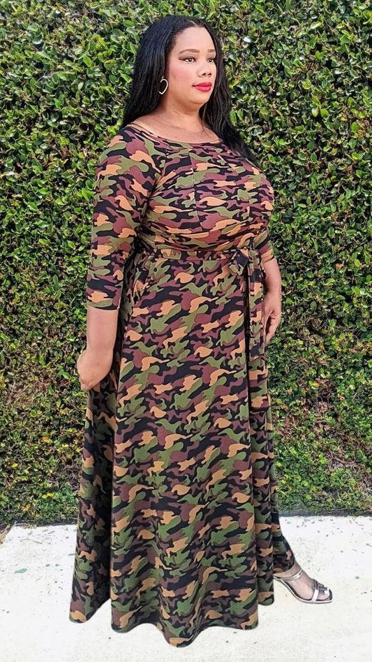 2072BN Plus Size Women Flare Camouflaged Maxi Dress with Pockets