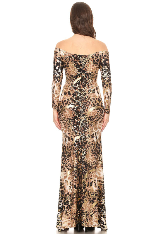 Women Chic Metallic detail Mixed animal Printed Off Shoulder Long Sleeves Sweetheart Neck Maxi Mermaid Dress
