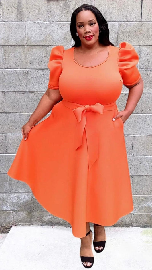 2890 Plus Size short puff sleeves V-Neck Flowy Flare Midi Dress with Pockets and Belt