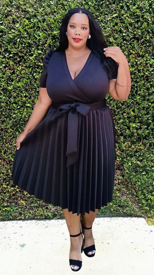 2902 Plus Size Short Puff Sleeves Pleated Wrap Front Flare Midi Dress with Belt