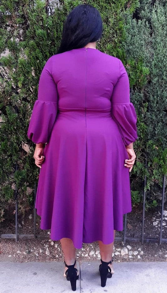 Plus Size Scuba Puffy Sleeves Round Neck Flare Dress With Pockets