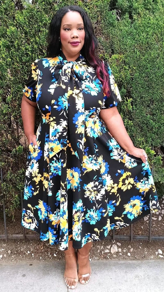 2852FL Viva Curvy Plus Size Flora Print Bow Collar Fit & Flare Midi Dress