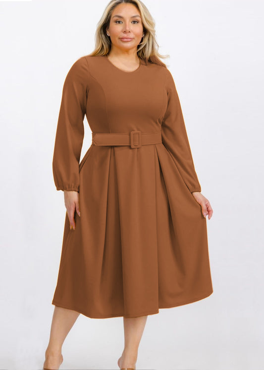 2930SO Plus Size Bishop Sleeves Sleeves Midi Dress with Belt