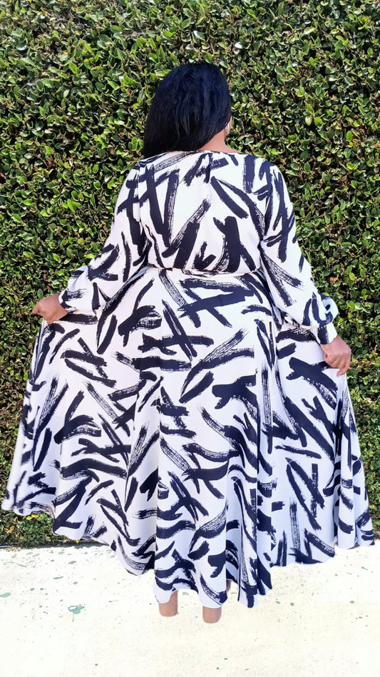 1050NN Plus Size Abstract Brush Stroke Print Flowy Beautiful Crepe Maxi Dress with Belt