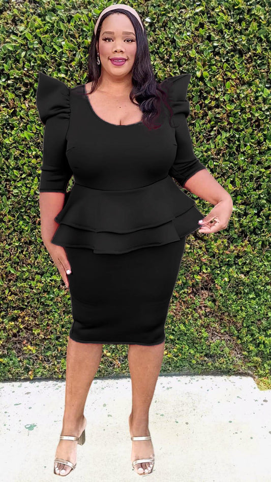 2977 Plus Size double Ruffled Sleeves Pleated Flare Midi Dresses