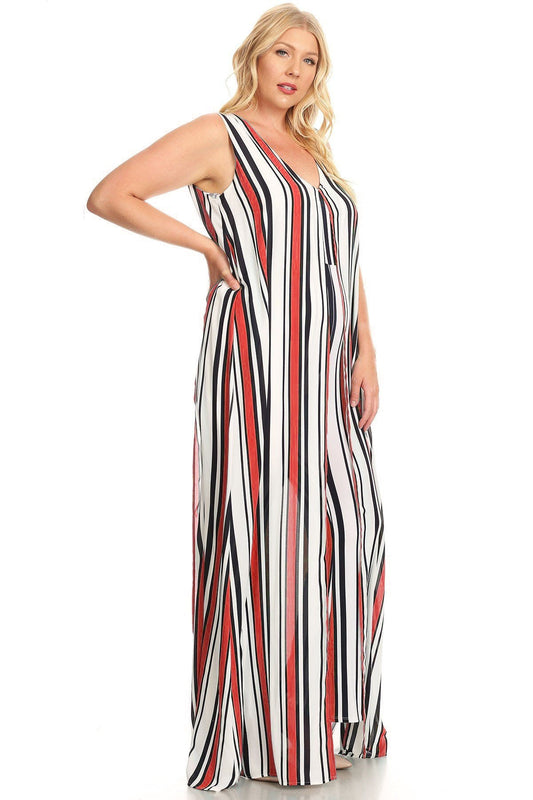 Plus Size Stripe Print Sleeveless Split Layer Caped Jumpsuit