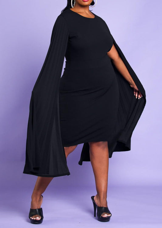 2839 Plus Size Women Pleated Cape Sleeve Bodycon Dress