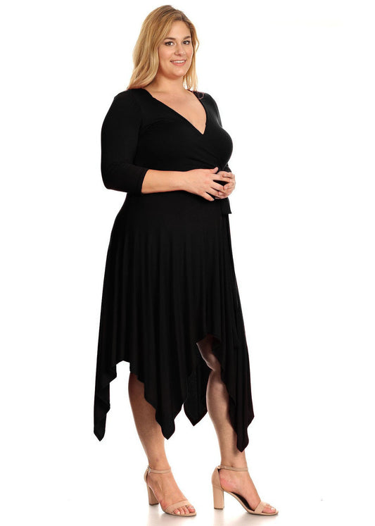 Plus Size women Asymmetric Pleated hem Wrapped Flare Midi Dress 3/4 Sleeves