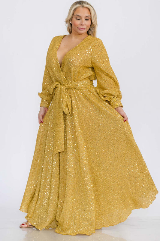 1050SQ PLUS Size Women Bishop Long Sleeve Shimmer Warp Flare Maxi Dresses