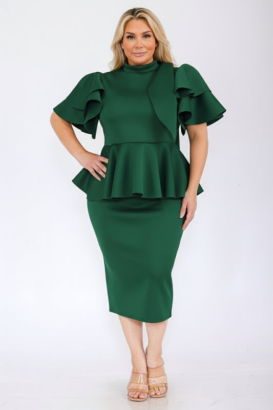 3001-SET Plus Size Ruffle sleeves Ruff Hem Skirts Set With Belt
