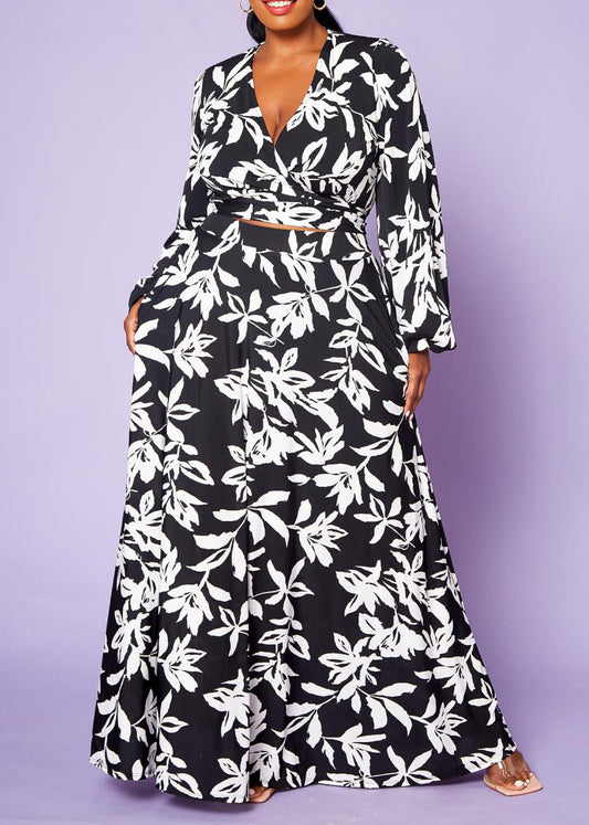 Plus Size Floral Print Long Sleeves Top and Skirt sets With Pockets
