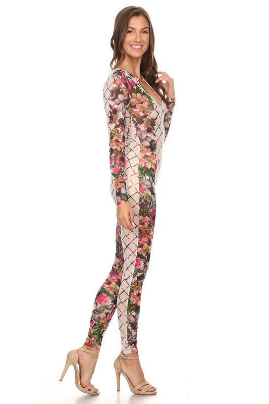 Women Floral Print Long Sleeve Fit Jumpsuit Front Cutout Detailing
