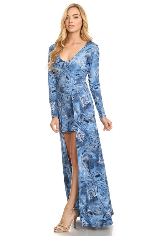 Women Denim printed Maxi dress with open front detail with shorts, long sleeves, and v-neck