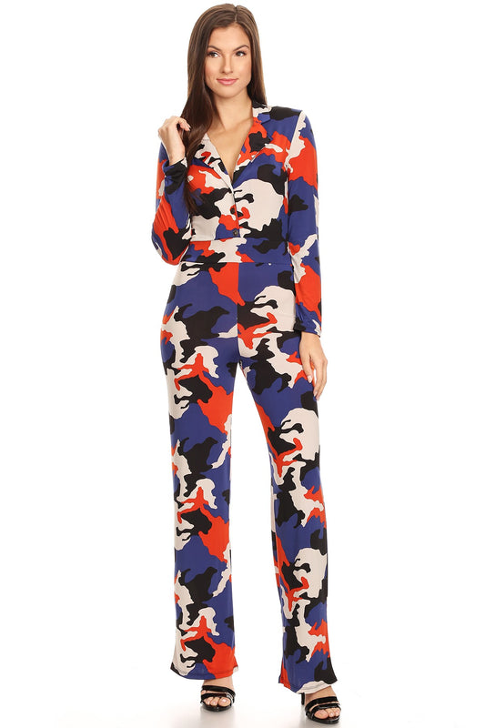 2351CM Women Lone Sleeves V-neck Camo printed button up front Wide Legs Jumpsuit in a relaxed fit
