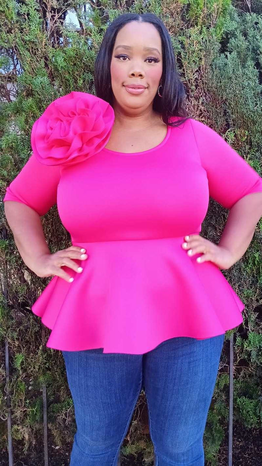 2883REG Women Ruffled hem Shirts Top with flower design shoulder and Zipper Back