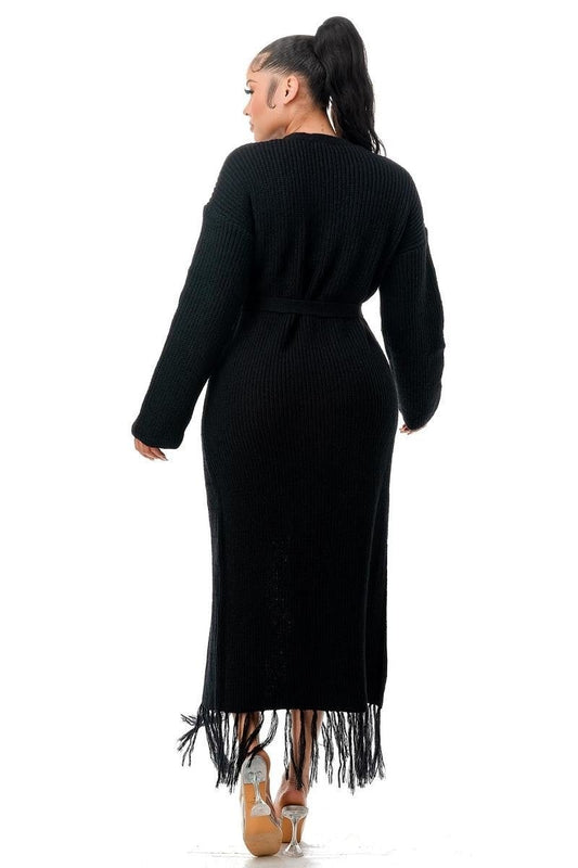 Women Chic Stylish Solid Long Sleeves Knit Cardigan With Fringe Hem and Belt