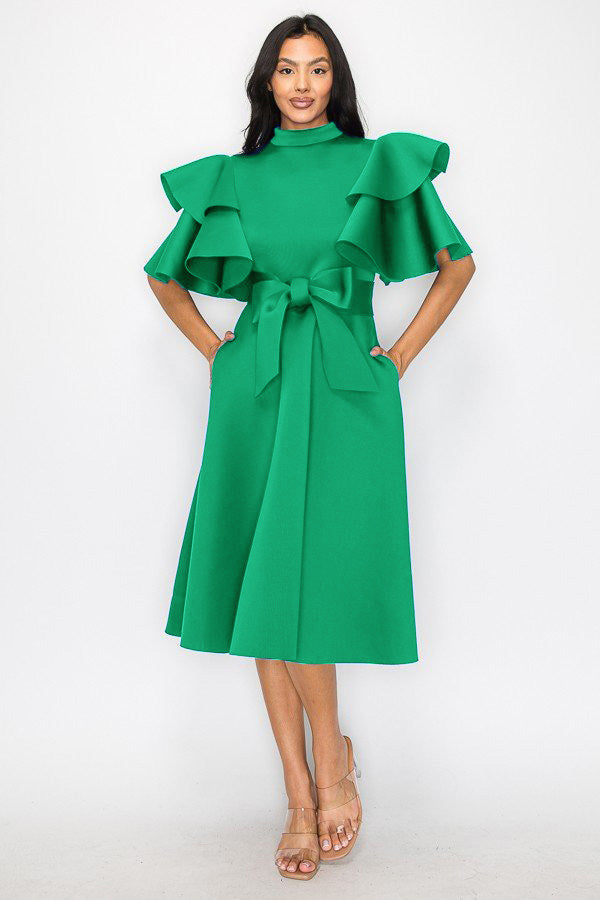 2898 Women Double layer Ruffled Sleeves Flare Midi Dress with Pockets and Belt