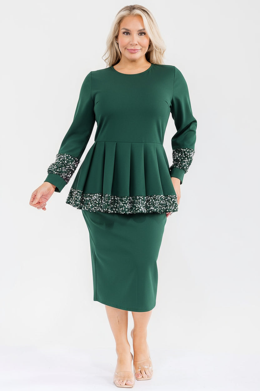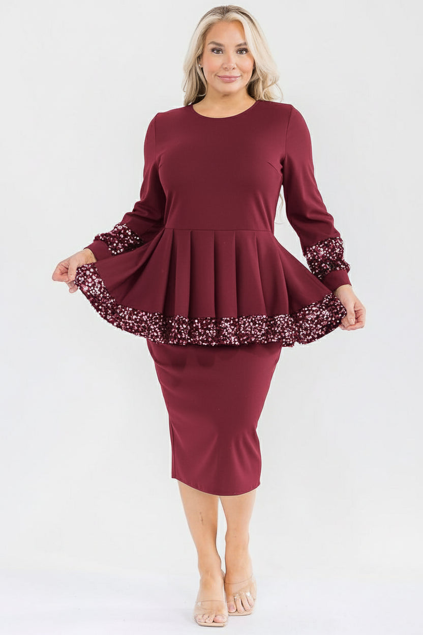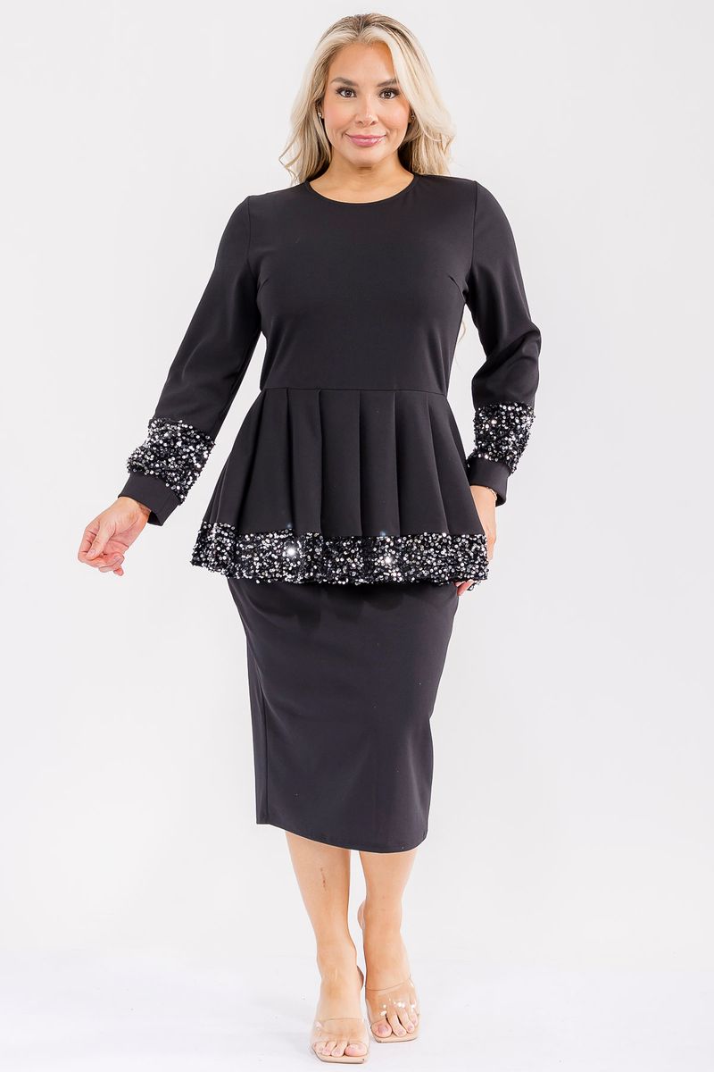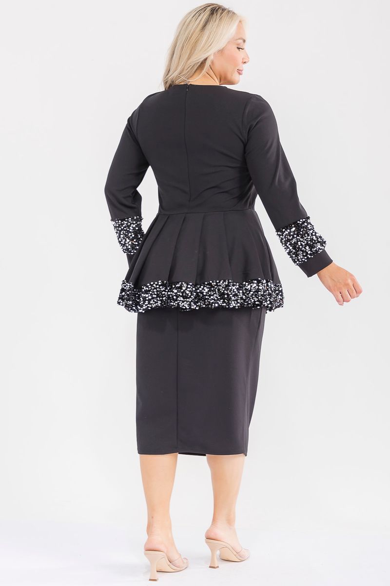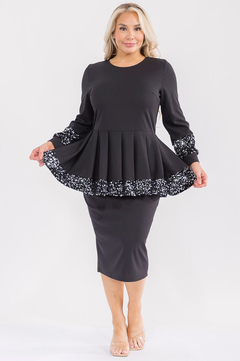 CREPE TECHNO SEQUENCE COMBO PLEATED PEBLUM ZIPPER BACK PLUS SIZE DRESS