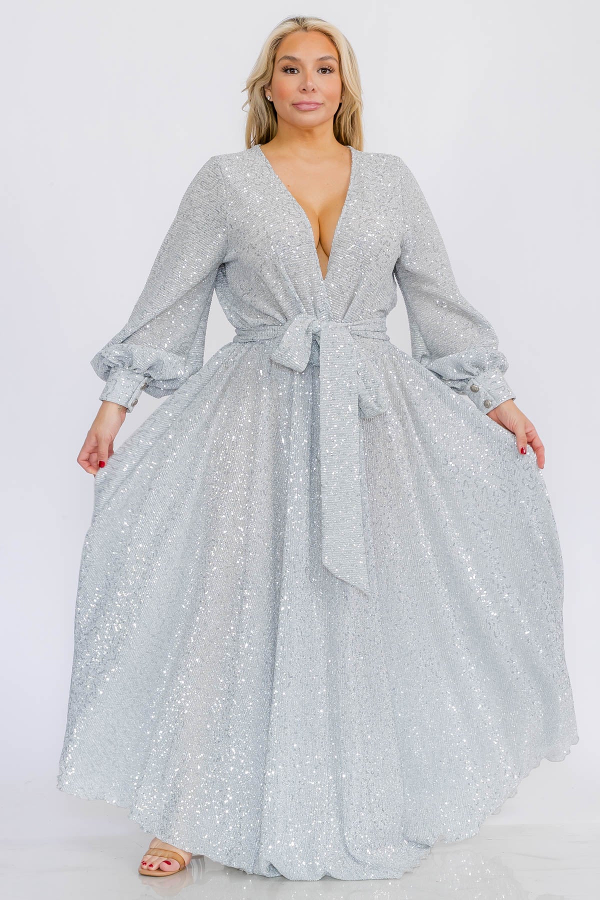 1050SQ PLUS Size Women Bishop Long Sleeve Shimmer Warp Flare Maxi Dresses